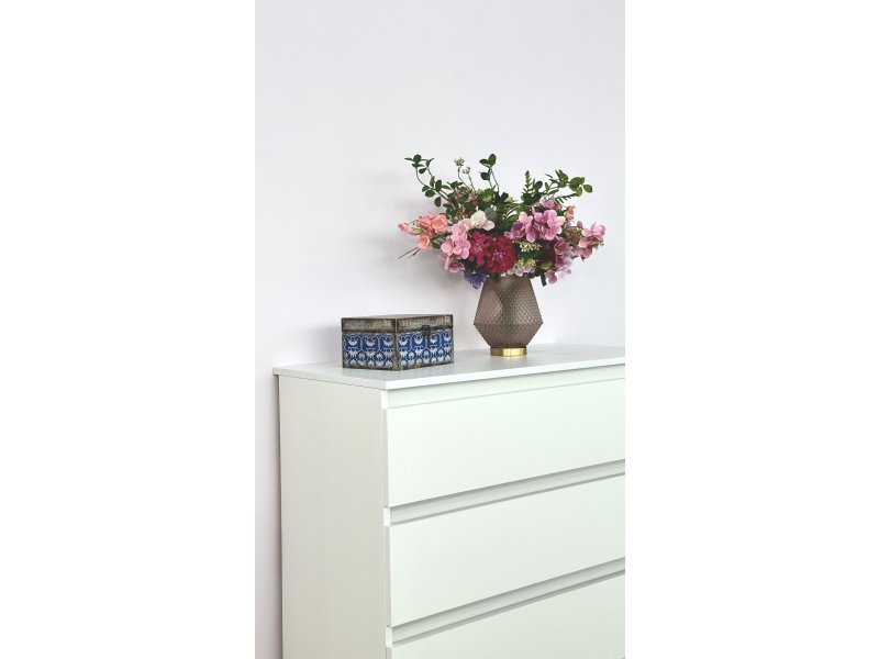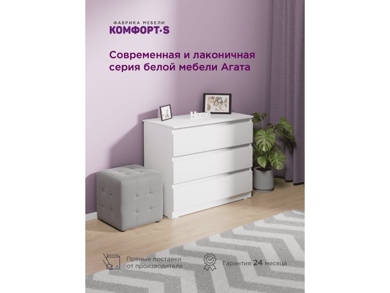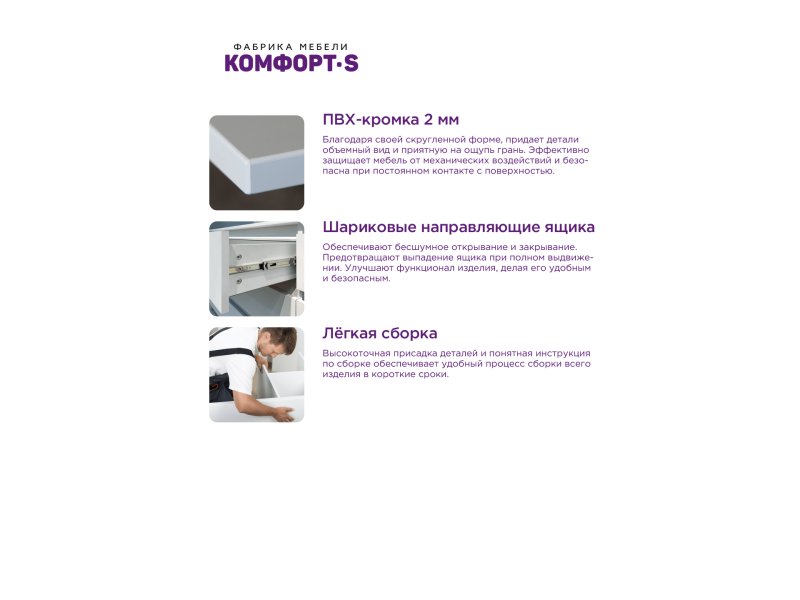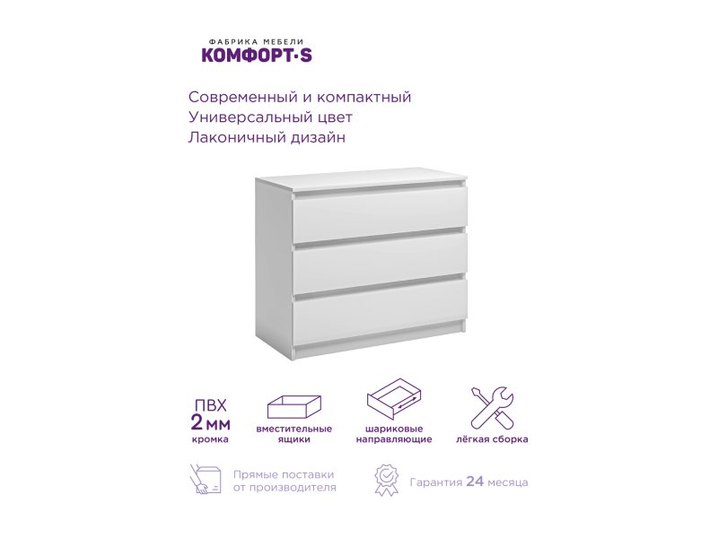 Комод изготовлен из ЛДСП с гладкой поверхностью, направляющие шариковые не полного выдвижения. Комод небольших размеров, но очень вместительный. Данная модель комода подойдет в детскую для вещей, игрушек; в спальню для белья, добавив зеркало, получится туалетный столик; в прихожую для мелочей; можно использовать, как тумба под телевизор. 3 выдвижных ящика глубиной 350 мм.