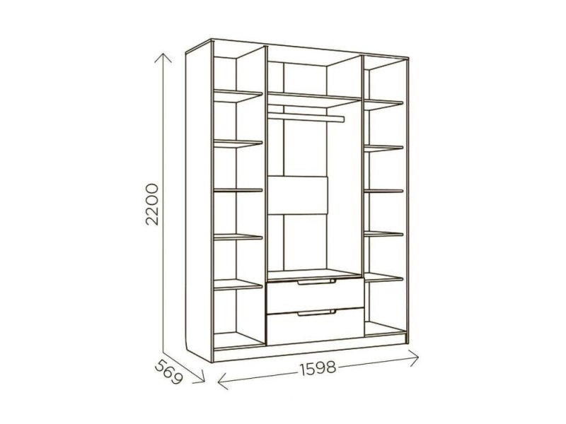 Внутреннее наполнение — 2 секции с полками, секция с вешалом, 2 выдвижных ящика