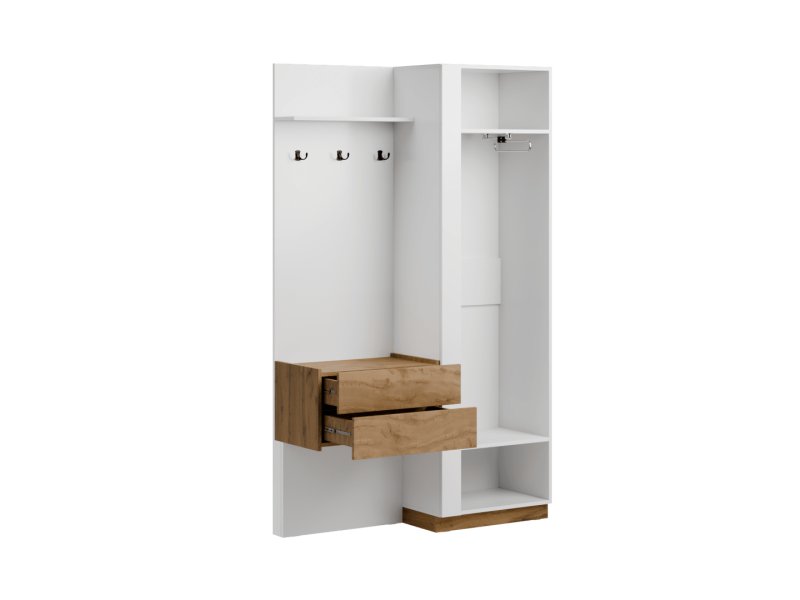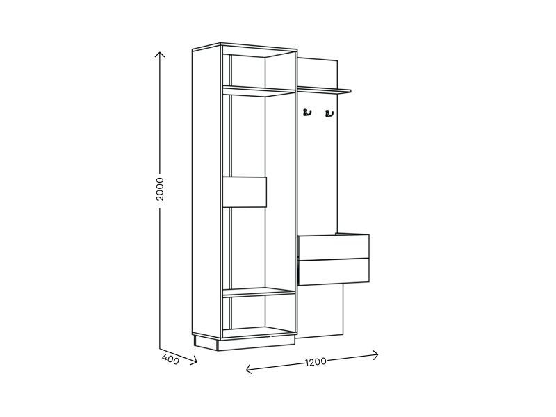 Внутреннее наполнение — Шкаф: секция с вешалом (микро-лифт), 2 полки. Открытая секция: 2 выдвижных ящика, полка;