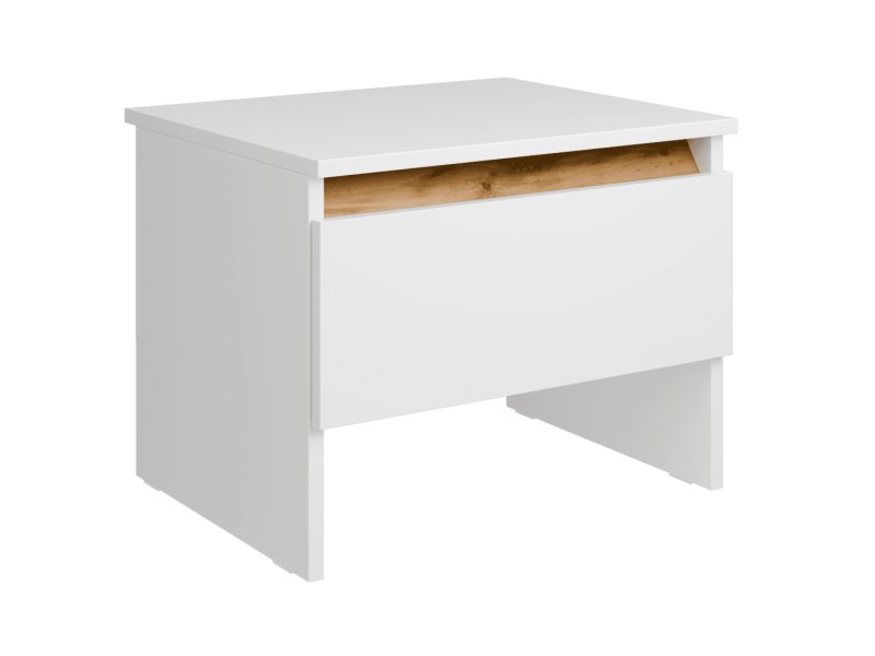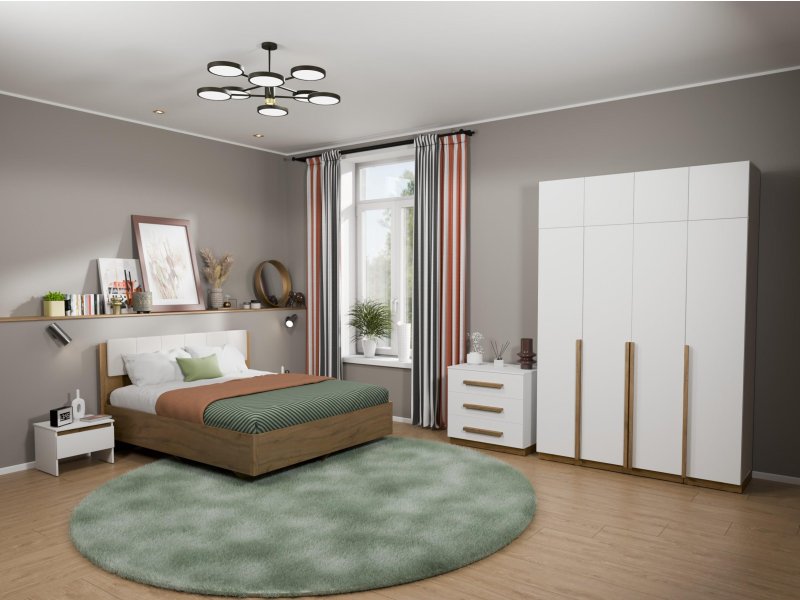 Материал корпуса — ЛДСП 16 мм; Материал фасадов — ЛДСП 16 мм; Кромка — ПВХ 0.45 и 2 мм; Цвет — белый/дуб вотан; Ручки — из массива дерева (дуб); Опоры — пятниковые; Фурнитура — ящики: шариковые направляющие плавного хода, дверцы: петли с доводчиками; Кровать — мягкая вставка из экокожи на изголовье, спальное место 1600х2000 мм, ортопедическое основание на ленточном креплении в комплекте
